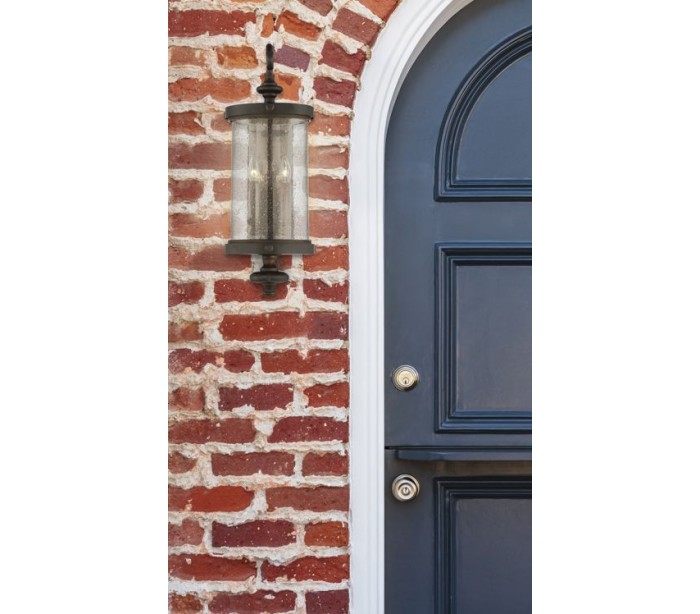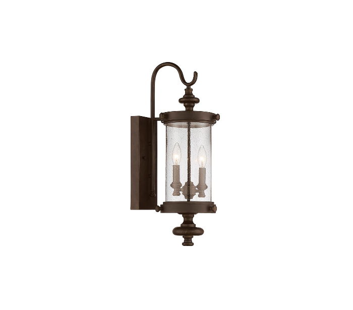 Palmer 2 væglampe udført i et design af patineret valnøddefarvet metal og klart glas med dråbe effekt. Lampen er fra amerikanske Savoy House og anvender 2 x E14 lyskilder og måler 61 cm i højden og 19 - 30 cm i bredde og dybde/fremspring.