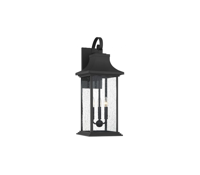Hancock 3 væglampe udført i et design af mat sortlakeret metal og klart glas med dråbe effekt. Lampen er fra amerikanske Savoy House og anvender 3 x E14 lyskilder og måler 70 cm i højden og 27 - 28 cm i bredde og dybde/fremspring.
