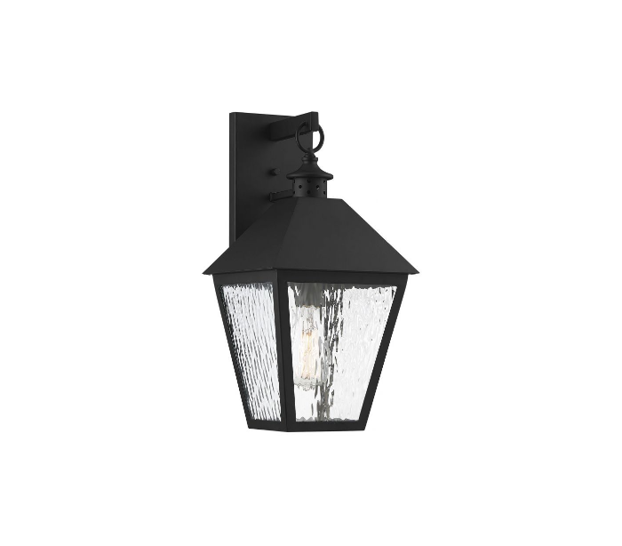 Harrison 1 væglampe udført i et design af mat sortlakeret metal og klart glas med bølget effekt. Lampen er fra amerikanske Savoy House og anvender 1 x E27 lyskilde og måler 46 cm i højden og 23 - 25 cm i bredde og dybde/fremspring.