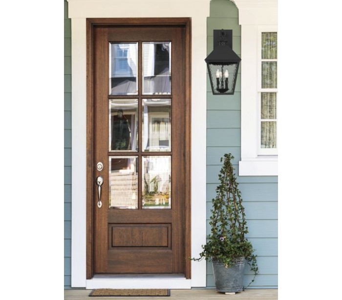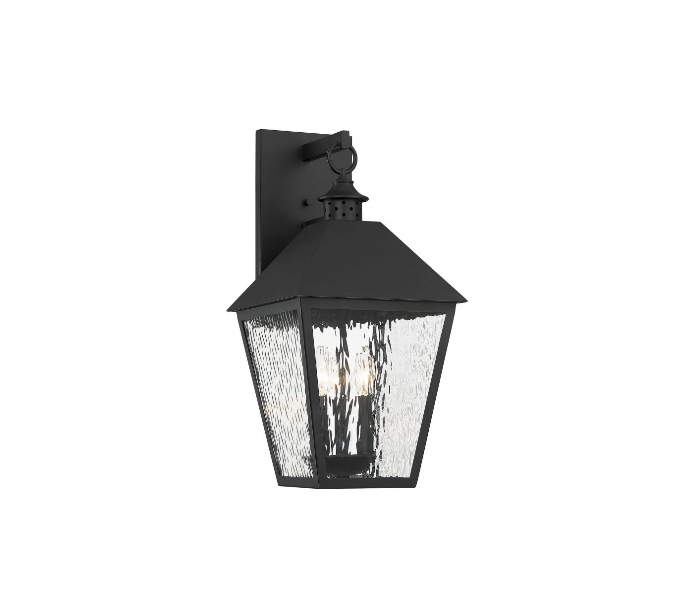 Harrison 3 væglampe udført i et design af mat sortlakeret metal og klart glas med bølget effekt. Lampen er fra amerikanske Savoy House og anvender 3 x E14 lyskilder og måler 55 cm i højden og 28 - 30 cm i bredde og dybde/fremspring.