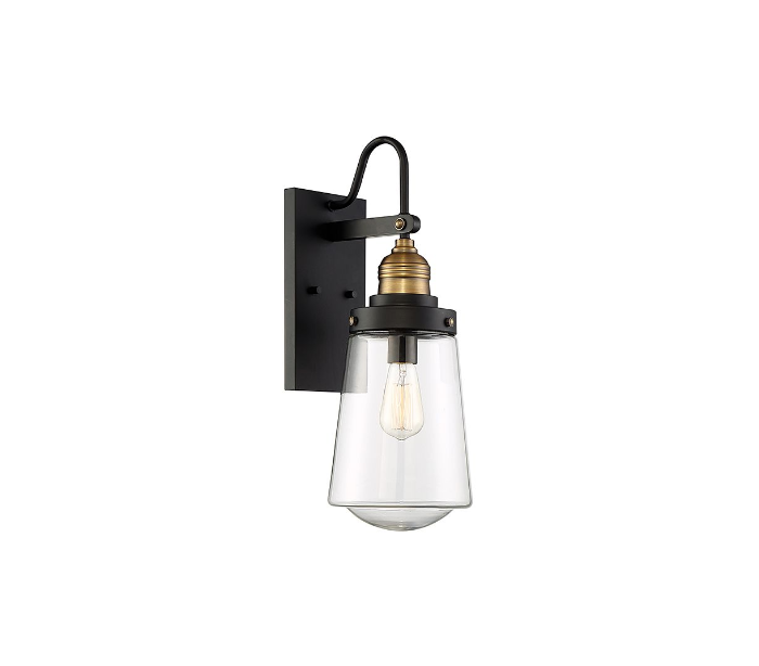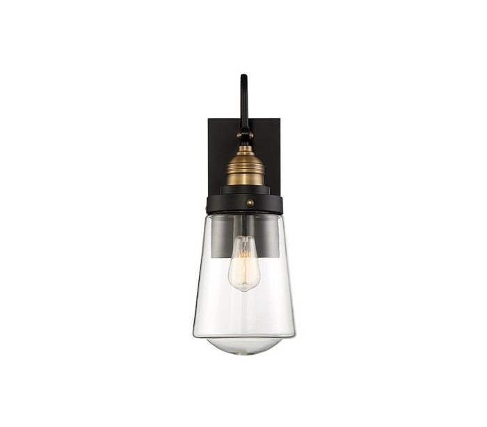 Macauley 1 væglampe udført i et design af vintage sort- og varm messinglakeret metal og klart glas. Lampen er fra amerikanske Savoy House og anvender 1 x E27 lyskilde og måler 34 cm i højden og 13 - 18 cm i bredde og dybde/fremspring.