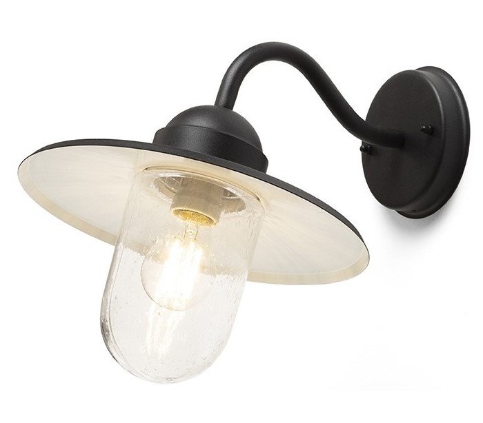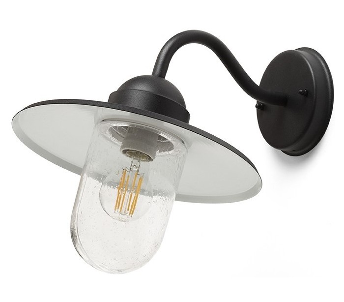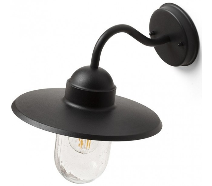 Beacon udendørs væglampe udført i et design af struktureret sortlakeret metal og med glasskærm med dråbeeffekt. Lampen anvender 1 x E27 lyskilde (Ekskl.) og måler 38 cm i dybde/fremspring og skærmdiameter på 29 cm.