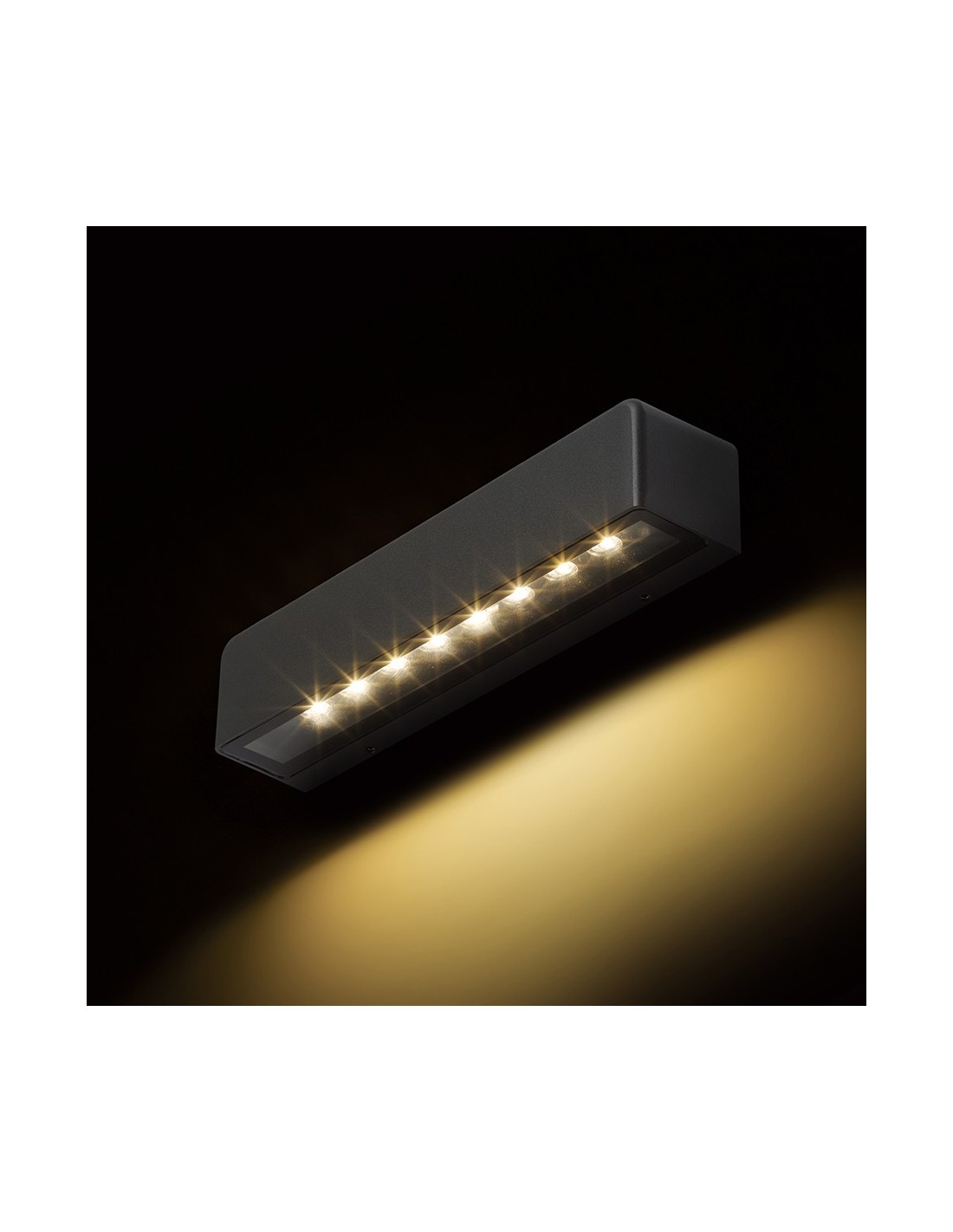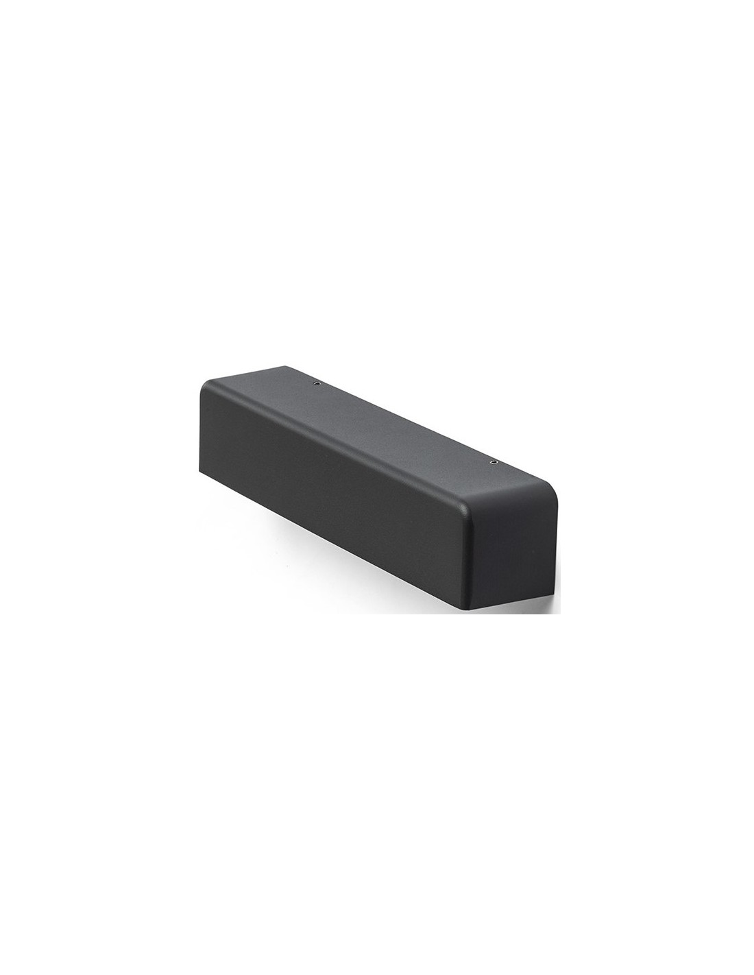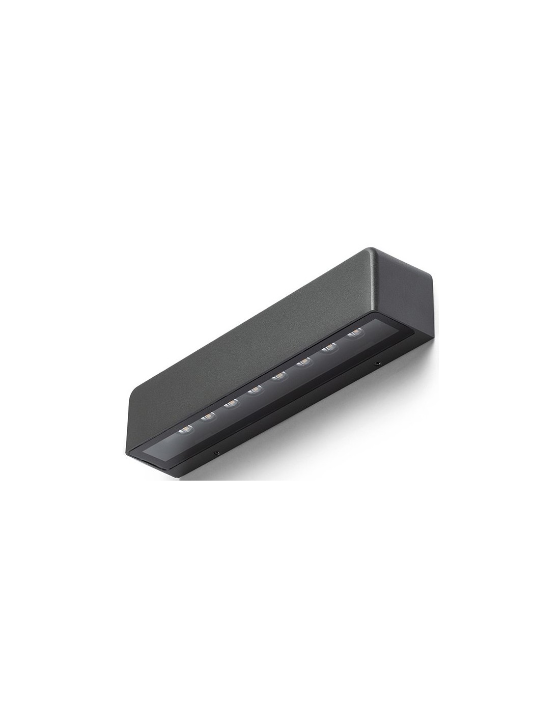 SAMPO udendørs væglampe udført i et moderne design af antracit lakeret aluminium og med 9W LED lyskilde. Lampen måler 26,2 cm i bredden og 5,4 cm i højden.