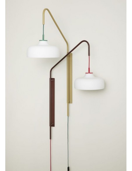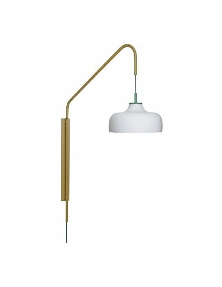 Hübsch Current væglampe udført i et design af metal og glas. Væglampen måler 111 cm i højden og 30 x 71 cm i bredde og dybde. Skærmen måler 30 cm i diameter. Lampen har 200 cm ledning med afbryder.