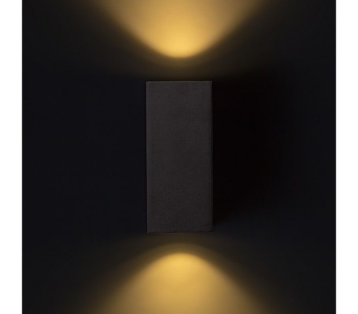Moderne udendørs væglampe i et design med belysning op og ned ad væggen, fremstillet i antracitfarvet aluminium. Lampen har indbygget LED lyskilde på kun 2 x 3W.