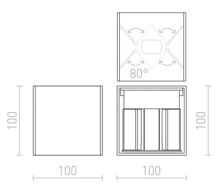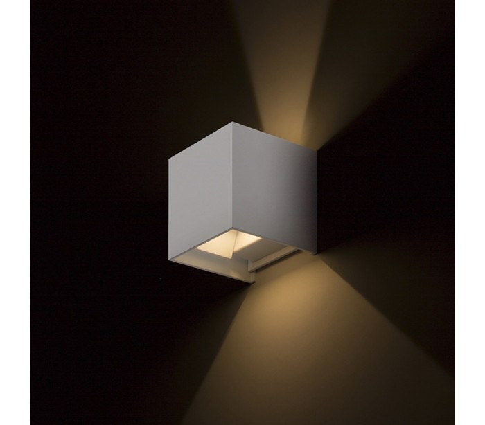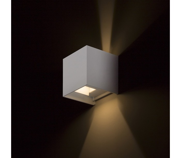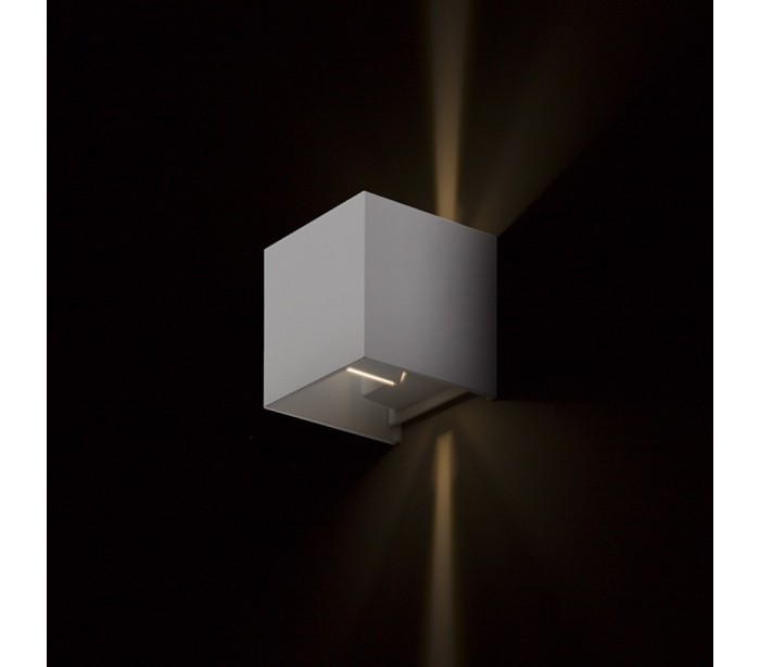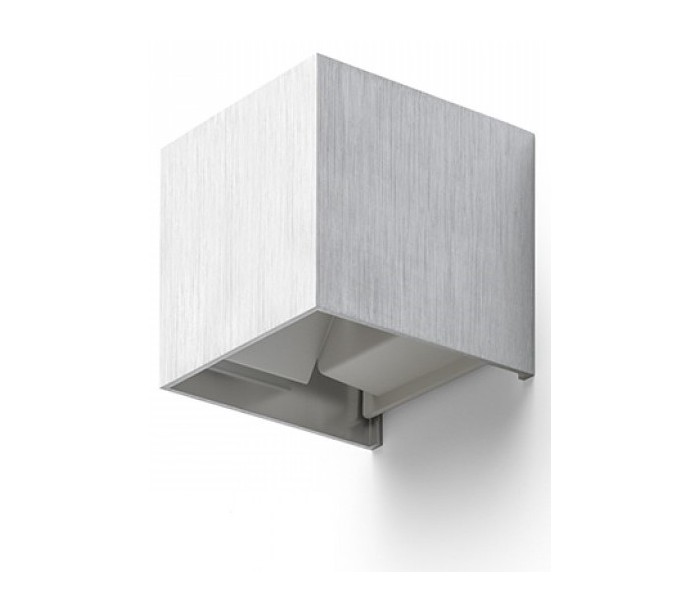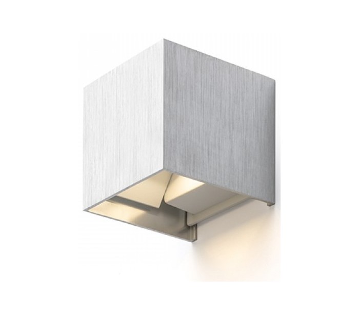 Væglampe til udendørs brug i et design, fremstillet i børstet aluminium. Lampen har indbygget LED lyskilde på 6W og kan justeres i måden som lampen lyser på, via 2 metalvinger.